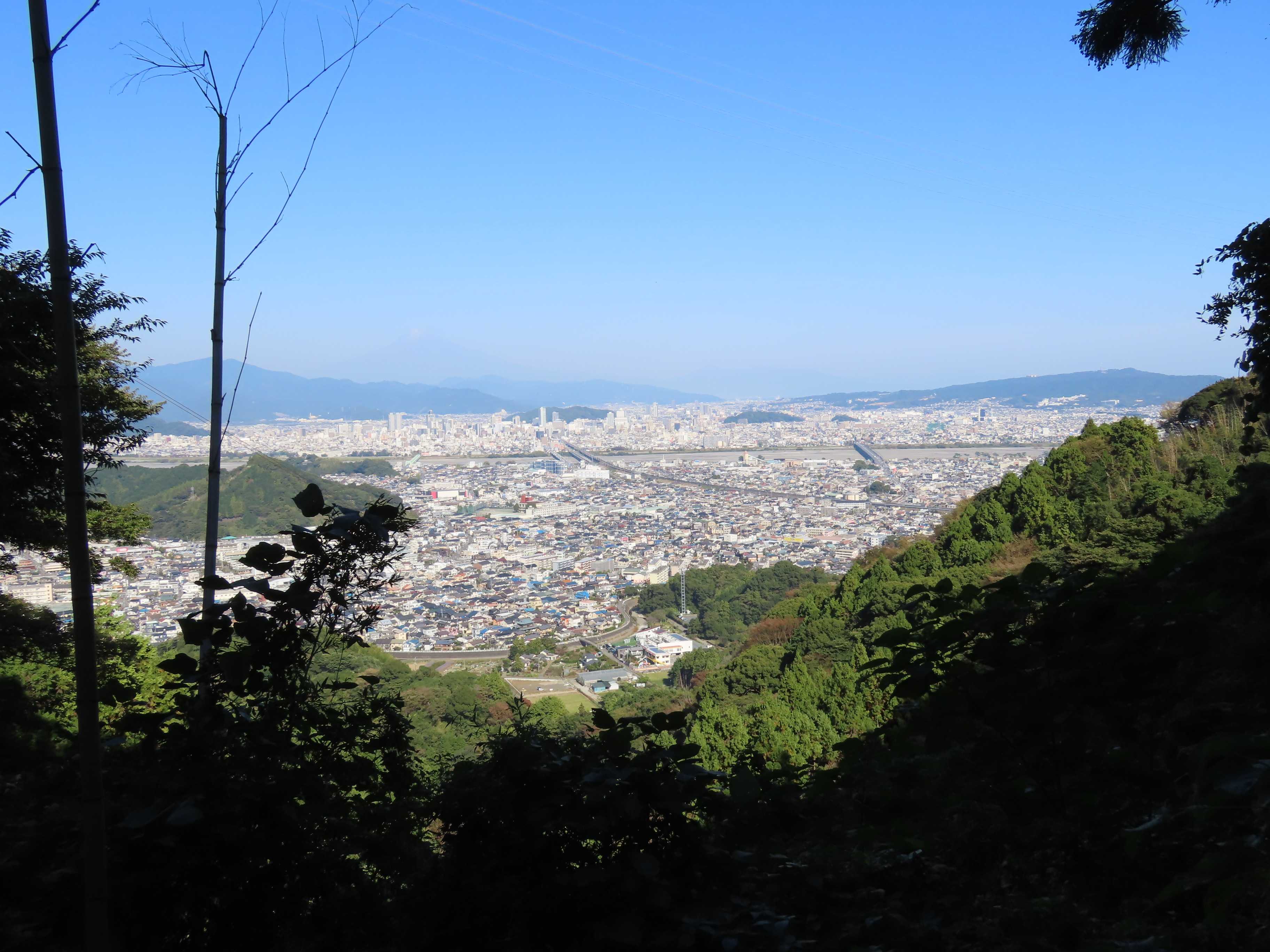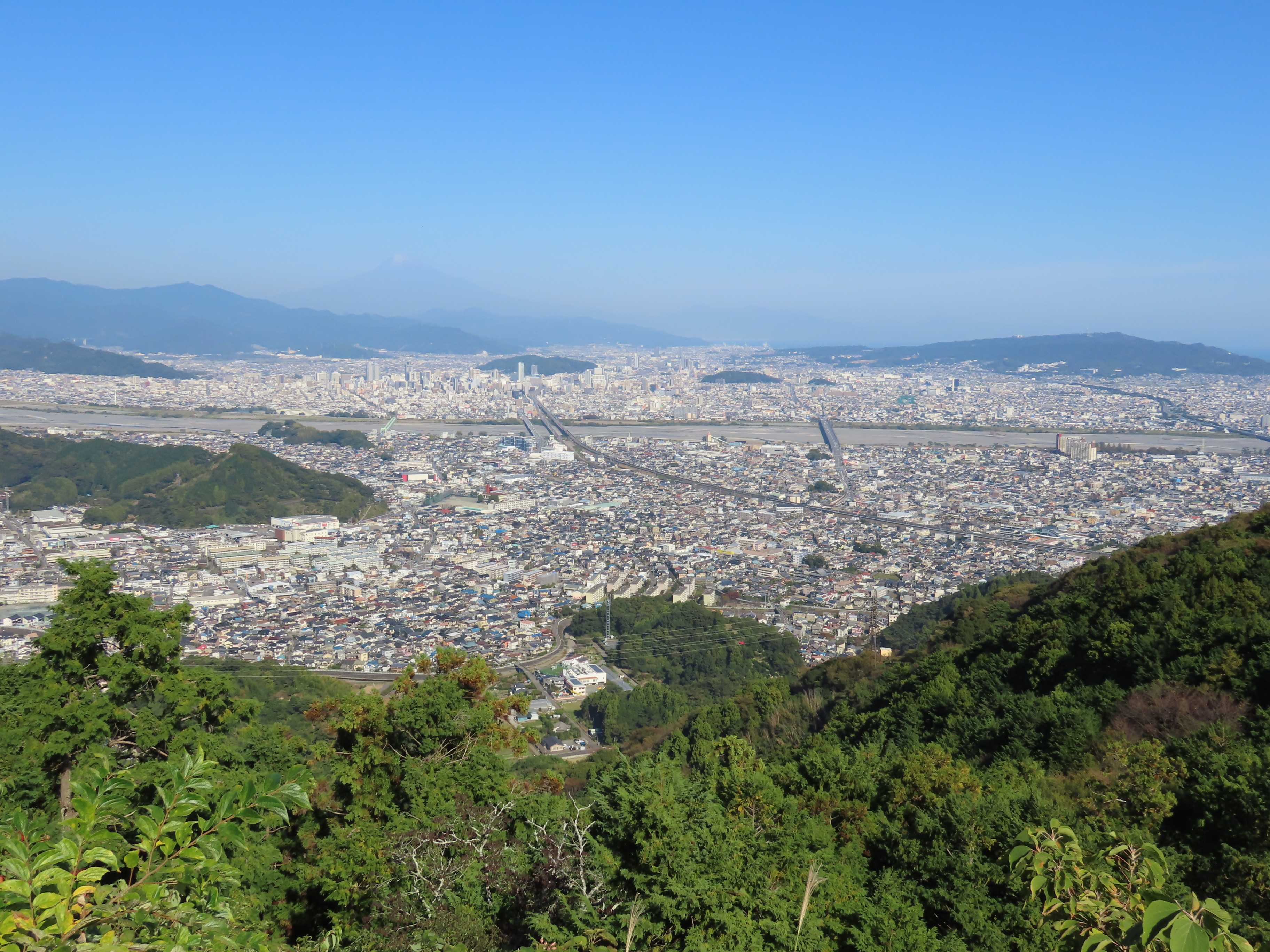 山頂からは、静岡市街、安倍川、国一バイパス、新幹線、東名高速道路、日本平、駿河湾、伊豆半島が一望できる!富士山は、今日の暑さでやや霞がちだがなんとか見えている~
