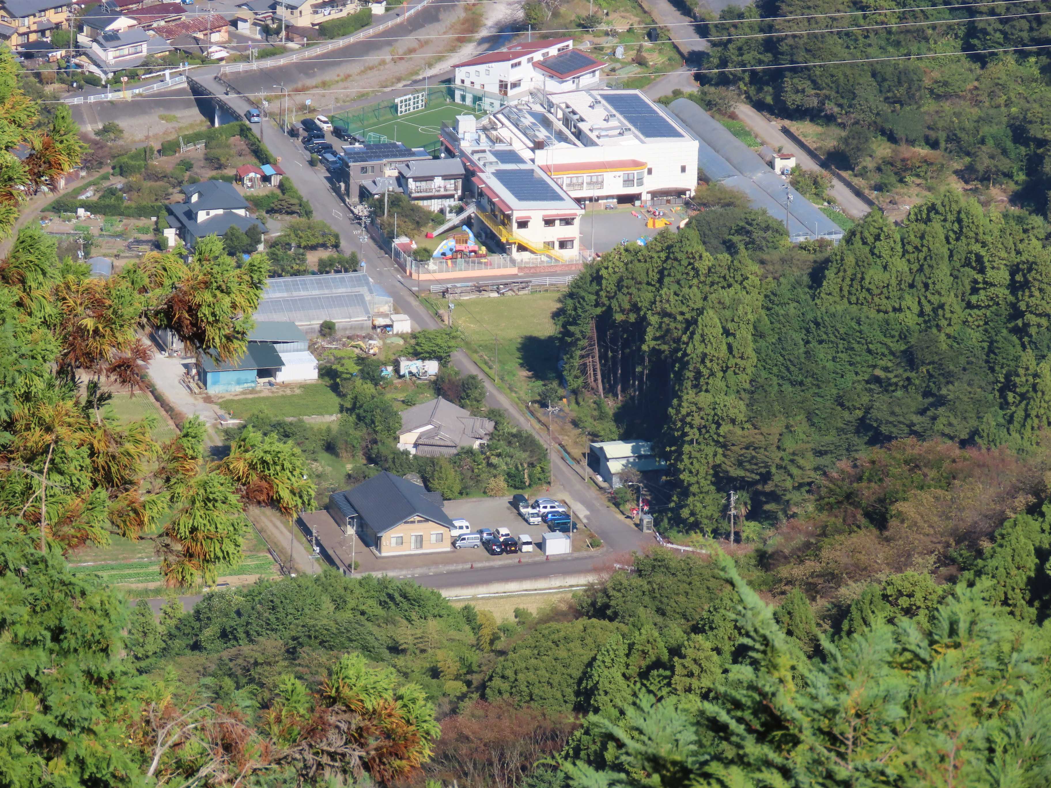 スタートした井尻橋と若杉幼稚園が眼下に見えている。井尻公民館は、手前の森に隠れて見えない~