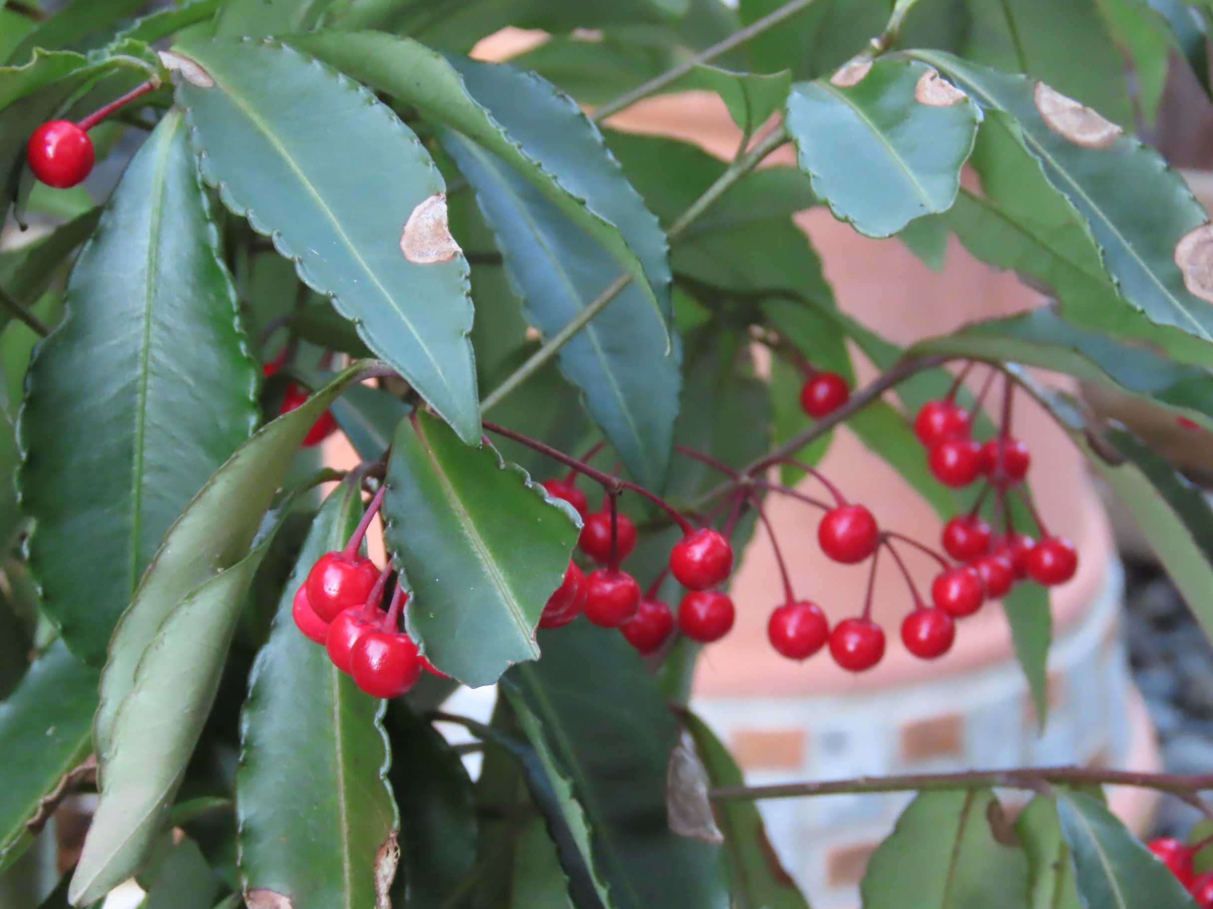 縁起を祝う木、千両、万両のこれはマンリョウ・万両(ヤブコウジ科)が鮮やかな赤い実をつけている。