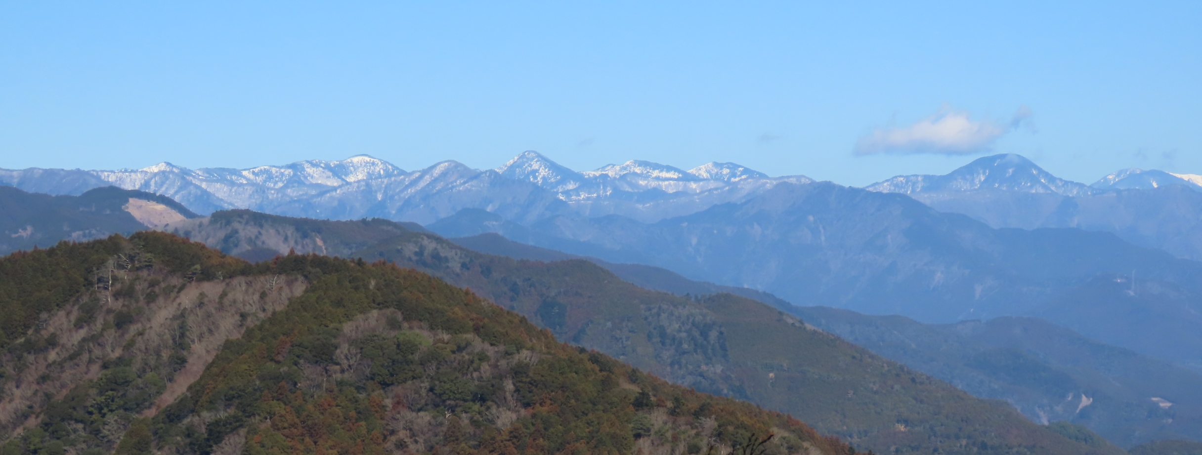雪の被った左から房小山、バラ谷山、黒法師岳等々、、若き日に登った懐かしい山ばかりだ!