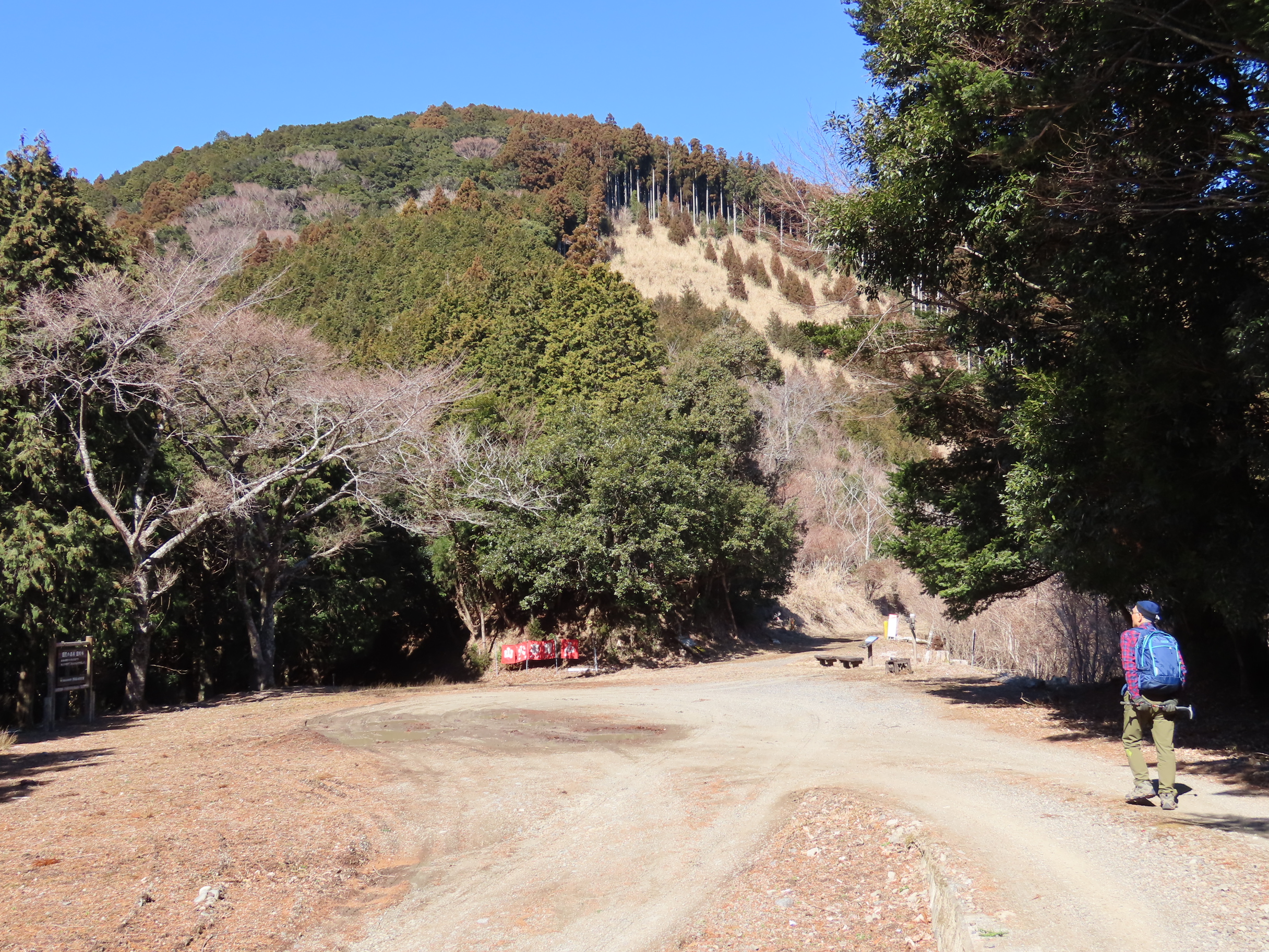 馬王平(530m)に出る~小広い広場で、林道が何本か交錯している~正面が八高山だ!登山道は左の植林帯と右側の伐採跡の境を直上している~