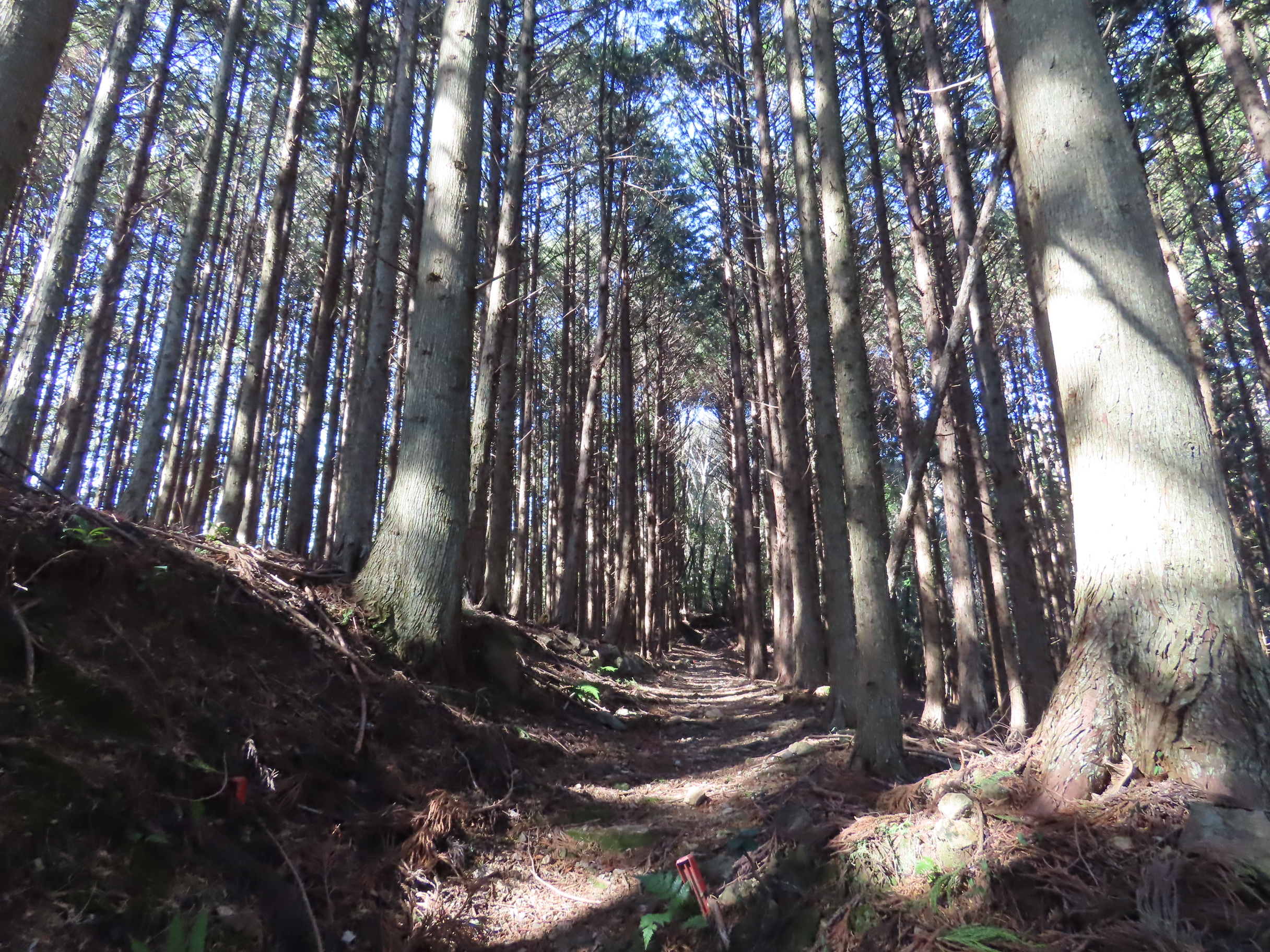 帰路はこの林道へ出るまでにひと苦労、コースアウトしてしまったのである。580mピークから南下し過ぎてしまい経塚山(きょうづかやま)に向かっていたことに気が付いて、地図、コンパスで現在地を確認し、登りかえしてこの地へ無事戻ることが出来た。この周辺は、マーキングや標識がないので要注意!道迷いしても不思議はない。後日、赤布かテープをつけに来たいと思っている。スマイル
