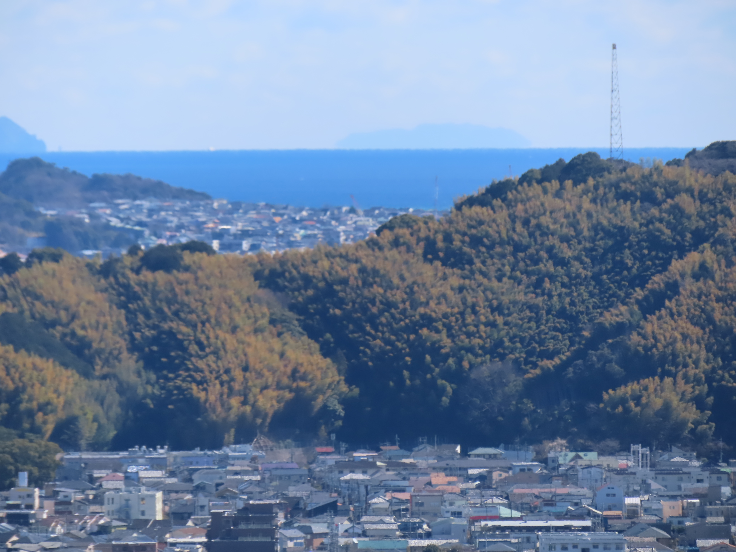 今日も視界良好!伊豆半島の西端(左側)から右方向に目を転ずれば伊豆七島のこれは新島だろうか?