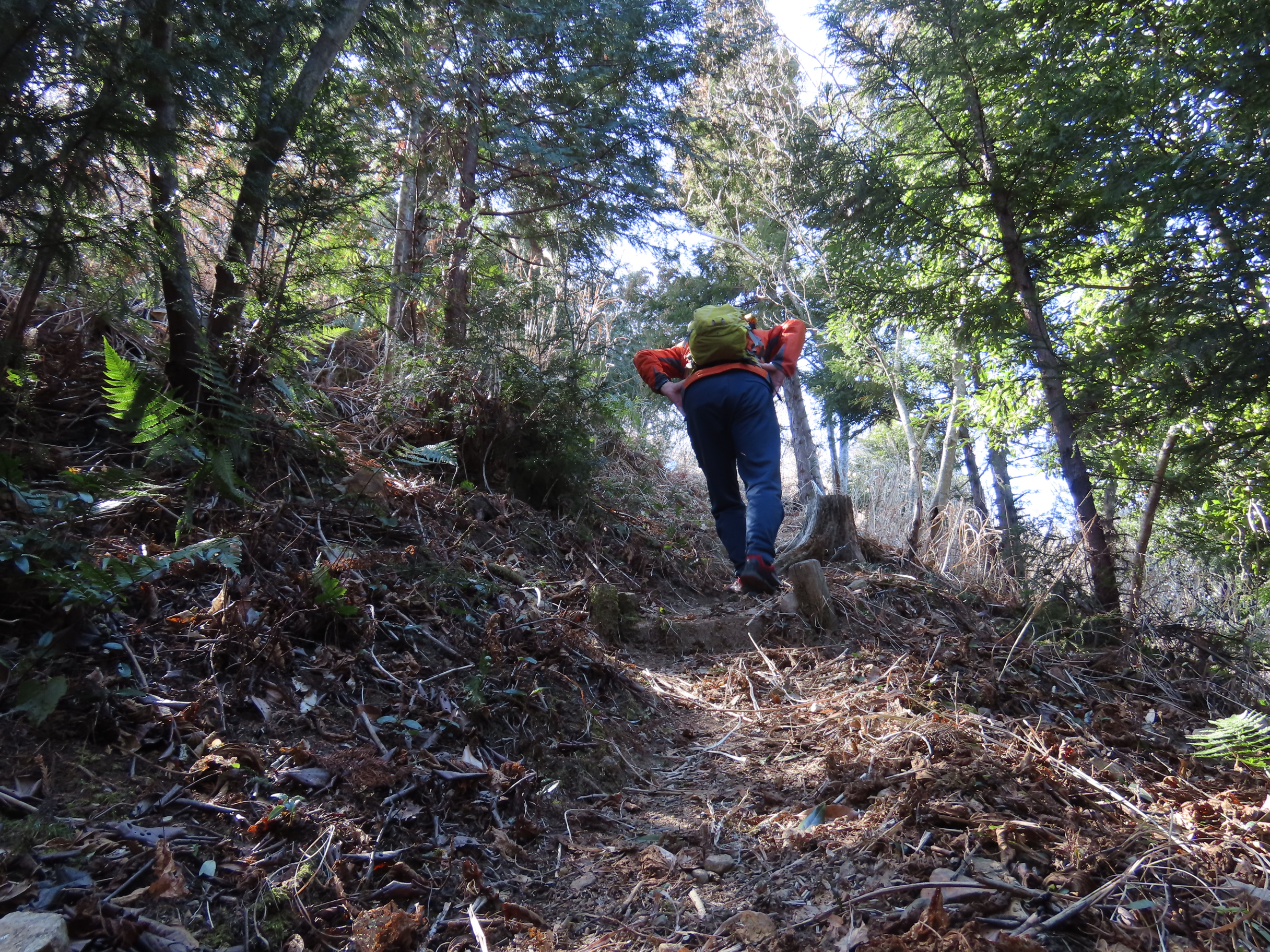その後始まる杉、桧の林の急登は意外に厳しい~植生が自然林に変わるにつれ傾斜はやや緩やかに変わり山頂が近いことを思わせる~