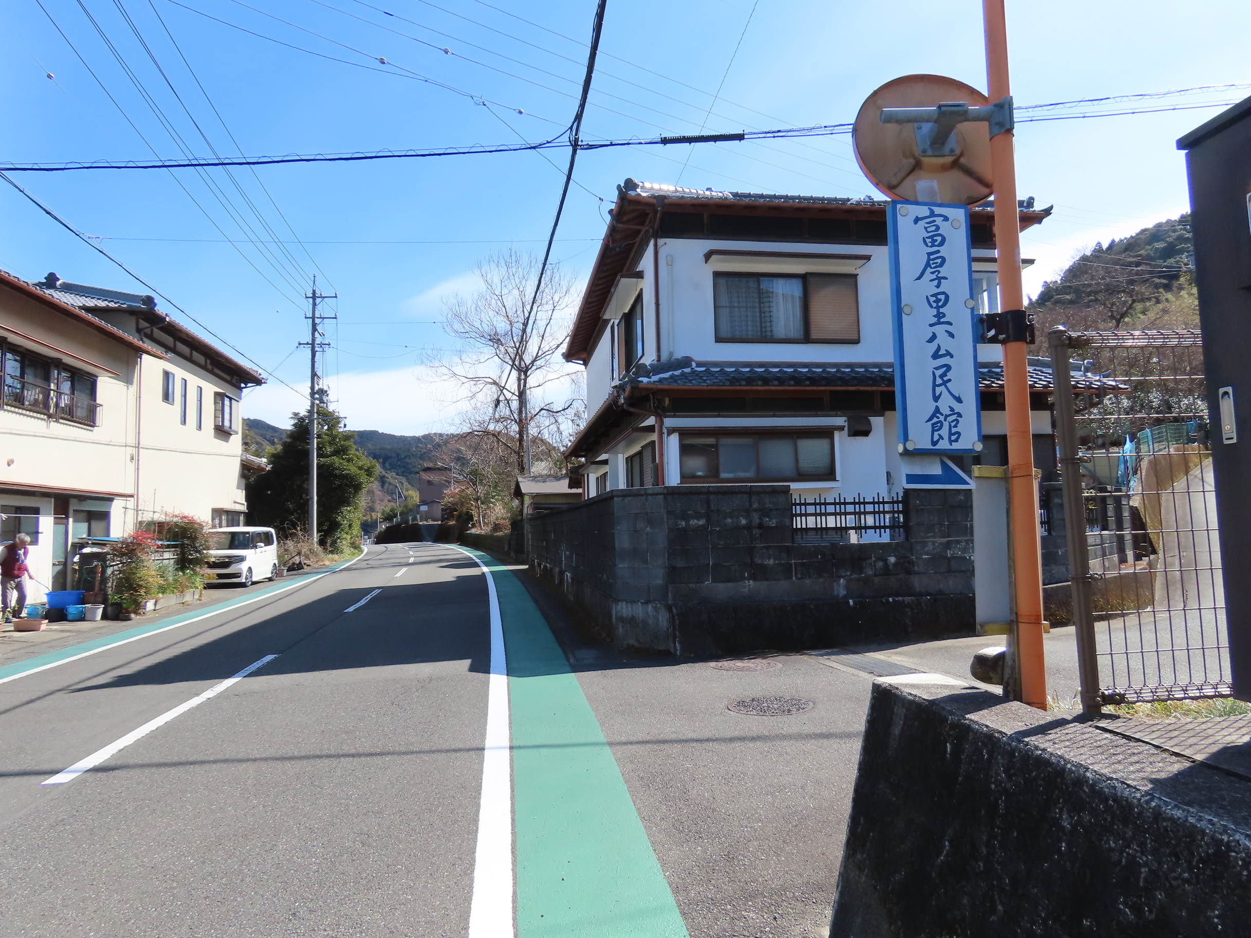 橋を渡ってすぐの十字路(南藁科街道)を左折し、富厚里公民館への案内看板に従って右折~