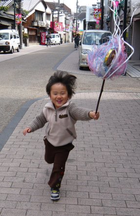 たっくんはまといを持って全力疾走しております。元気なんはエエけど飛び出しなや。祭りにはまだ早いで~。