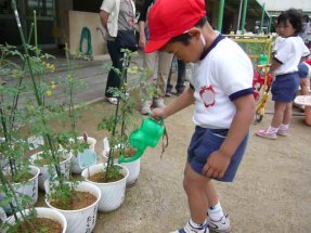 今日は父親参観の日でした。みんなでプチトマトを植えて育てています。雨降ったから水は少な目な~。まだ緑色ですが小さいのが7個なっていました。教室の後ろに皆が描いた絵が貼られている。たっくんの絵を見つけました。ママと二人で「誰を描いたんやろ?」と考えていましたが、おそらくアンパンマンかな?それとも自分?!パパと一緒にお遊戯をしました。普段と比べ今日はたっくんはかなりハイテンションだったようです。幼稚園終了後もジャングルジムで遊んでいます。まだまだ帰れへんで~。大体1時間ぐらい遊んでからでないと帰らないようです。家に帰ってきてからはパソコンで落書きをしました。「家」を描いてくれたそうです。たっくんお疲れ様でした。