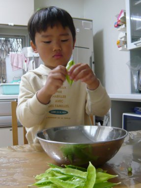 今日はお料理のお手伝いをしております。えんどう豆をむいております。結構真剣です。上手にむけてるやろ?たっくん上手にできました。