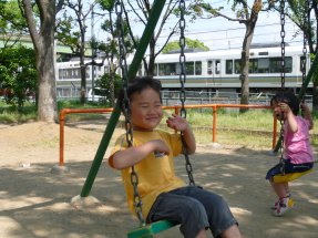 今日は、はるかちゃんが来てくれました。一緒に遊びます。ブランコにのってエエ顔してます。気持ちエエな~。すべり台の上でもエエ顔してます。