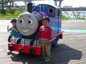 トーマスの催し物があり見てきました。一緒に写ります。持ち時間は2人1組で5秒だそうです。(隣の子は誰だか知りません)係員の説明では「5秒の間に写真を撮れない場合は再度並んでください」とのこと。たっくんは5秒の間に無事撮ることができましたが、泣き叫ぶお子様などは再度並んでいたようです。