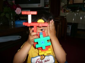 日曜日のお仕事の予定が急遽中止となりましたので休日となりました。ブロックで遊んでいるたっくんを撮りました。「ブロックで片目をブロック」なんちて。今日も力いっぱい遊んでます。