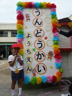 今日は運動会です。記念のメダルをかけて正門で入口で撮りました。本来であれば運動会が始まる前に撮るようなものですが、忘れたので運動会終了後に撮りましたよ。首からかけているメダルは運動会終了後に全員にもらえるのもです。おもちゃみたいなものを想像していましたが結構しっかりしたものでした。ミッキーちゃんになってます。あっ、前の人のビデオも写ってますね。