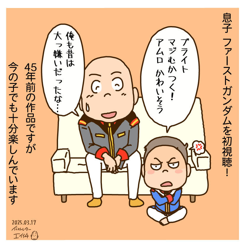初代ガンダムを息子と視聴開始大人になって見直すとブライトさんの気苦労がよくわかりますね^^#ガンダム #小学生 #ゆるいイラスト #ゆるい絵お問い合わせはイラストレーターエイイチHP
