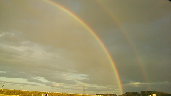 お休みでもあまり外に出ずに引き籠っている人が朝からお出かけしてきました!!そんなご大層な目的があって出たわけではないんですけど、ね。ちょっと映画館に。ついでにちょっとしたお出かけ用のポシェットというかミニバッグが欲しくてそのままイオンモールを散策。残念ながら気に入ったモノが見つからなかったのでドトールでコーヒーブレイクしてから帰宅しました。その途中、夕立にあいましてコレもたまたま虹が二重になっているのに遭遇!思わずタブレットでパシャリ!良さ気な一枚が撮れました。コレだけで十分、良い一日になった、かな?ポシェットは良いの見つからなかったけど。