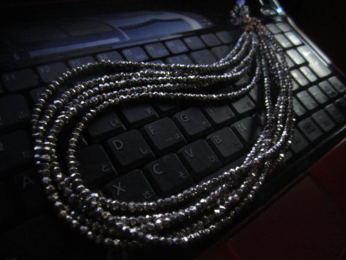 *** シンプル&ゴージャス *** 前からパイライトは好きだったが、もっぱら普通のまる玉かラウンドカットをつかっていた。 が、最近ボタンカットもなかなかいいのではないかと・・・。 先日大学の頃やっていた女の子バンドのメンバー6人が 南は九州から、北は青森から、卒業以来初めて全員集合した。 記念にこのパイライトのボタンカットの1連のネックレスを全員に! メンバーの「友情の証」の一言に大いに盛り上がった楽しいひととき。 あ~この6人はきっとおばあさんになっても 集まったとたん女子大生のようにはしゃぐにちがいない!!! メンバーの首や手首で光るパイライトを見ながら私は確信した。 ちなみに画像は5連のタイプ。でも1連はシンプルでしかも十分ゴージャスなのだ!