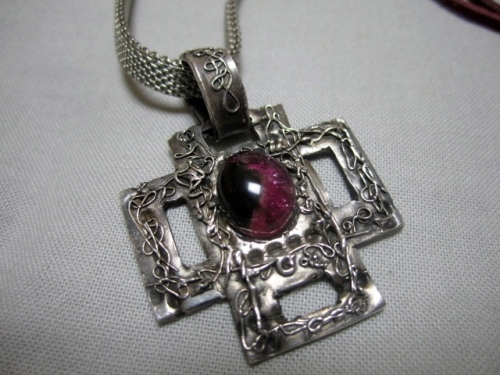 さ メッシュの太めのチェーンとよく合うクロスのトップ・・・最近のシルバーの作品です。 ツートンカラーのピンクトルマリンがいい感じ!! クロスが重い感じにならないように四角に抜いたのがミソ!? 残念ながら画像の合成などがまだよくわからないので画像そのままで。^^;