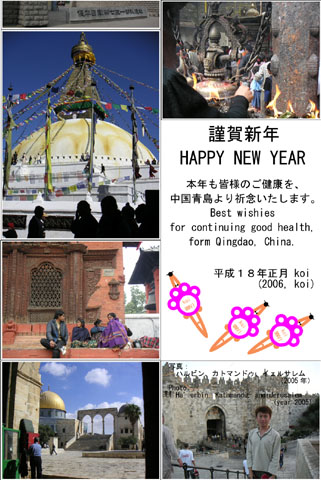 今年もヨロしうに今年の目標。『精進す』ね。何をトートツにこの男は? とお思いかも知れないけど、なんかカッコイイ感じ。精進する男。きゅぅ~ ストイックぅ~いや、前々から2006年はチベットに、カイラスに巡礼しに行くって目標があるのだけど、ただカイラスに行きたいってのは完全に物見遊山そのものでイヤ。だから、試してみたい。ワタクシ、仏の道を歩めるのかな? って。そろそろ解脱に向けての自己調整を始める時期じゃあないのかな、って。前世のイエティが非常に徳を積んでくれていたんで(←人事っぽく書いているけど、自分なんだよね)、その徳をどう持っていくか? それが今回の課題だと思うんだよね。その方向性を探る為にも『精進』しなくちゃ。でも、なんだか日程的に込み入っちゃって、夏にチベット行けないかも。初冬なら時間作れそうなんだよなぁ~・・・じゃ、冬行きゃあイイじゃん。つーことで。愛のプラトー・チベットは、本当に冬寒いのか? もし寒かったとしても、それは耐えられる寒さなのか? を確かめに、この春節は『カム!!』(←前回は「カム!」って感嘆符1つ)と題して四川省の甘孜チベット族自治州に再度行こうかな~ って。イヤね。スリランカまで行くお金、なくなっちゃったんだ。この後、入用で入用で。結構お金(人民元)使う予定が盛りだくさんだから、すこしセーブ。基本的に日本円には手をつけないよ! 今はマグロ漁船状態なんだから、日ノ本口座は基本的に温存だよ!!これも啓示。因みに既に来週末となった日ノ本行きの飛行機代を銀行から引き落としてきたら、残高がピッタリ『0元』になっちゃった。今日から3連休。昨日、一昨日と、『夕食を2回食べる日』が続いたのでちょっと食べすぎって気がする。一昨日は、最初に自作ご飯食ったんだけど、その後「おそ松君のソバ」喰いに行ったでしょ。昨日もねー大晦日。なぜか会社は3時に終わった。何で? 誰が決めたのさ? イイのか? そんな人民ルールバチバチでイイのか?この取り決めを知ったのが14:40で、ヒジョーに焦った。2005年、最後の最後までアタマガイタカッタデスーその後。ムックが自分の部署の子たちを引き連れて「請客(qing1 ke4、振舞うって意味みたい」らしく、コイさんも一緒にドーですか? 是非一緒に、いや必ず一緒に行きましょう! と連行された。あのー どーして夕食会が16時からナンデスカ?(←これは15時終業の為) それも、おそ松君の店でだよ?オイラ、2日連続でおそ松君と一緒。あのさー 今日は、この後、小金持ちな青い島の人の家に連れて行かれて、21時から始まる花火大会を高みの見物予定なんだよ。しかも、夕食を食べながらってコトなんだよ。まぁ食べる量をセーブすればイイのだけど、目の前に食べ物があって、それで食べないわけには行かないじゃん。つーか、箸が止まらない。ああ、オイラご幼少の頃からこんなに大食いだったか? 何時から大食いになったんだ?いやー 先ずは夕食その1、おそ松君食堂でフツーに沢山喰った。その後小金持ちの家に行って、今度は火鍋(寄せ鍋、今日は赤くなかった)をフツーに喰った。多分、おそ松君から一緒に同行しているヒトがいたら、何でそんなに食すのか? って気持ち悪く感じるんじゃあないかって程喰った。しかし、ナカナカ花火が始まらないねぇ。ひゅるる~ って、しょぼい個人花火だったら数発上がってた。まさか、コレじゃあねぇーよなぁ~?結局何時までたっても始まらない。なんでも、青い島のシンボルである得体の知れない不気味な赤いオブジェがある公園で、集会(カウントダウンの催し。今日のホストは「集会」と言っていた)があるらしい。じゃ、行ってみるか!と外に出る。集会場に行ってみた。ら。公安(警察)が路上封鎖していた。ココから先は立ち入り禁止だ!! と。 『活動已取消』「2006年まであと*****秒」って電光板があったのだけど、そこに浮かび上がる『活動已取消』の文字。うははっ 大笑いだ!用意してあったのか? 予め「*****」の部分は数字だけが浮かび上がるんじゃあなくって、活動已取消も点灯できるようになっていたのか?人民カウントダウンも見てみたかったけど、これはコレで面白かった。【後々聞いたのだけど、なんでも7万人が詰め掛けたらしい。それで危なくなって活動取消状態だったらしい。 オイラが思うに、最初っから何のイベントも準備していなかったんじゃあねーのか? 準備間に合わなかったとかさー】そんな大笑い大晦日も更け、今日正月1日。赤い国では1月1日を「元旦」というらしい。日ノ本語だと、元旦は「元日の朝」って意味だよね、正確には。ソコが少し違うところな。気分だけでもお正月! ってコトで、お正月料理を作った。とりあえず毎年作ってる「根菜類のお煮しめ」とお雑煮。黒酢で作ったから汚い色になった紅白なます。余ったコンニャクと豆腐で作った田楽。あと、秋元小姐が作った似非栗きんとん。そして・・・天婦羅!ざ・じゃぱにーず・てんぷーら!マトモに大量に天婦羅作るのは初