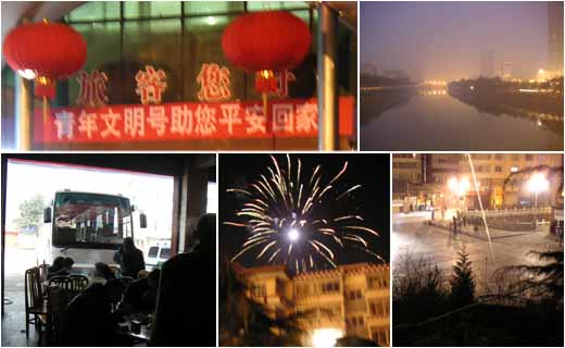27日の夜、出発したんだけど。。。出発前ね、my仕事場の隣の工場で大きな花火上げていたんだ。暫くして。守衛「+@**!!! &4D”!!!」なんか叫んでいる。ワタクシを呼んでいるっぽい。つーかぁ~ タクシーで空港まで行くからって呼び止めてもらうよう頼んであったんだけど、その時間までまだまだ30分以上あるじゃんよぉ~ って旨を述べる為に外に出た。守衛「早く早く早く早く!!! 早く降りて来い!! 後面爾、火※#〒◎!!!」この守衛、訛っててしかもスゲェ早口(←ヒトのコトは言えないが)なんで、何言ってるか理解がムツカシイ。しかし、聞き取るところ、なんか出火しているらしい。カナリ焦っているらしい。守衛「水持って来い! 火事! 火事! 火事!!!!!」お手伝いしましたともさ。水持って出火場所まで行きましたともさ。さっきの花火の火の粉がmy仕事先の裏庭の枯れ草に燃え移ったらしい。多分、どこもかしこもこんな事多発してんだろーなぁ~しかし。火の回り具合の速度・現在の火の大きさから見て、水かけるよりも、叩き消した方がイイんじゃあねーの? と火はお友達なオイラは冷静に近くにあった箱を持って叩き消し始めたのでした。ワタクシ、オツムで勝負だから。そんなケチも付いて出発!飛行機で成る都に入り、宿を取る。で、翌朝(28日、つまり今日)、ダルツェンドまでのバスのチケットを買い、バスに乗る。成る都→ダルツェンド(康定)まで所要7時間程かな?16時ごろダルツェンドに到着。さて、明日の朝の「ダルツェンド→ガルゼ(甘孜)」のチケット買うんだぁ~・・・ん? つーか、なんかバスターミナル、陰気じゃねー? いや、確かに以前もこんなウラブレた雰囲気だったけど、今日はヒトが全くいないんですけど・・・ ソレにも増して、バスの行き先・出発時刻・値段・残りチケット数などを表示する電光掲示板、電源落ちてるんですけど・・・今にも売店を閉めよう、って売り子がいたので聞いてみる。なんでこんなに暗いのさ? 明日、甘孜行きたいんだけど、チケット買えないじゃん?娘「甘孜? バス? ないわよ」はぁ? どーして!?娘「春節だもん・・・ 次のバスは、初五(旧正月が初一、初五は2月2日に相当)よ」成都行きなら毎日あるらしいが、さぁ困った! どー考えても甘孜行けない!!まぁ、仕方が無い。公共のバスがなければ他に何か方法があるかもしれないし、このバスターミナルにいても意味がない。とりあえず、宿を確保・・・と! 外に出てビックリ!! 道沿いの店、殆ど全てシャッター閉じてる!!ああ、今日は『除夕(旧暦の大晦日の赤語表記)』だからですか? これから家族団らんでギョーザ喰ってテレビ見るんですか?なんと、宿も閉まっているところが多い。困ったなぁ・・・でもダルツェンドの定宿(黒張蓬、BlackTent Guest House)は開いていた。ほ。と、今日はこんなもん。同宿の3名(koi、人民男『is』、仏女『クララ』の3名)と従業員のチベット男『アリ』でずーっと話してオシマイ。だーって、何もする事ないんだもーん。しかししかし。人民が皆見ると言う噂の「過年テレビ番組」(過年とは「年越し」の意)を見ることが出来た。なんか、多分クダラナイ内容だと思うよ。字幕が無いから良くわかんなかったけど。大勢が踊ったり、歌ったり、吉本新喜劇みたいな笑い劇があったり、それがダラダラと。なんで皆が見るのか? 他に番組が無いからなんだろうか?午前0時チョイ前、空襲警報が発令された。すげぇ花火爆竹の嵐!こんな田舎町(とは言っても、甘孜州の州都ではあるのだけど)でもこんな大量の火薬硝煙!! 今年花火爆竹が13年ぶりに解禁された北の京はどんななんだろ? 想像したくない・・・大気汚染と騒音を気にすることも無く、花火は小1時間程隆盛を極めた。写真(上段)左:『青年文明号助nin平安回家』(ninは『イ尓』の下に『心』、丁寧な2人称) バスターミナルに掲げてあったのだけど、サッパリ意味分からん。 後半は理解可能。「無事に帰省できるようにお助けよん」ってコトだろ? しかし『青年文明号』が分からん。飛行機にも『青年文明号』ってプレートがあった。文明ねぇ・・・右:朝の成る都。 中華世界の中心である北の都から結構西にずれてるんで、朝7時半でもまだこんなもん。(下段)左:バス移動途中時の昼食休憩。バスがね! バスが!! スゲェ綺麗になっていた!! 暖房完備だし、リクライニングシートだし、ゴミ箱まで沢山備えてあったよ!! ビックリ! 因みに成る都→ダルツェンド間のバス代は129元だった。 最初114元で「え~ 2004年よりも高くなってるぅ~」って個人的文句ブリブリだったけど、 バスに乗った後で15元さらに再徴収された。ひょっとして、春節料金?中央、右:ダルツェンドでの花火。上手く撮れなかったから掲載してないけど、坊主も花火してた。 花火は坊主も好きなんだな。ヤッパリ。そーだ。ココから先は漢人が少なくなるから、漢人のお祭りである「春節」の影響が少ないだろうって読みだったんだよな。そういえば。チベット正月「ロザール」は1ヶ月後だし。だけど、や