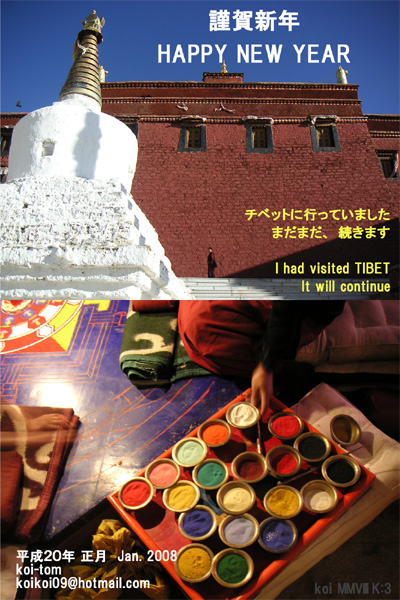 今年の目標。既に『koi様最強計画』に決定。昨年の目標「自然に投げキッス」も持越し!で。皆様、あけましてオメデトウございます。今年もヨロシク。写真は『ガンデン寺』にて。ところで、画像中に干支の「鼠」は見つかるかな?そうそう。今年のチベット計画。1、ラブラン2回目初詣(済)2、7月にカム、2週間ほど(←大体決定。アポイントメント取得済み)3、冬にラサとかレーとかの大きな都市再訪(←今、思いついた)あ! 平成20年! 運転免許書の更新しないと!!!(使ってないけど)