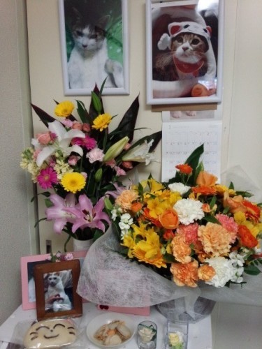 にゃ-ちゃんが旅立ってから、1年が過ぎてしまいました。2014年は私にとって、3匹の猫を続けて見送らなければいけないという悪夢な年でした。にゃーちゃんを亡くしてから、半年程続いた、神経性の胃腸の病気も最近はだいぶ回復しました。今日、久々にあっちょ君とにゃーちゃんの動画を見たらスイッチが入ってしまっていつまでたっても会いたいし、抱っこしたいです。にゃーちゃんの命日を覚えて下さってたお友達達から、こんなすごいお花(右側)が届きました。にゃーちゃんも虹の橋で、ありがとうって言っていると思います。本当にありがとうございます。いつか、虹の橋で会おうねにゃーちゃん
