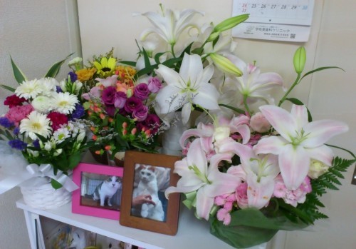 すずちゃんに沢山のお花を頂きました。送って頂いた方々ありがとうございます。あっと君とすずちゃんのスペースが華やかになりました。毎日、蕾が1つずつ開いてきてとっても華やかになりました。昨日やっと、大学の先生にも報告をしました。あっと君の担当だった先生はお休みで報告はできなかったのですが腫瘍科の先生にはご連絡できました。腫瘍科の先生、本当に良い方で。闘病中も本当に親身に対応して頂いて、詳しく病気の事を教えて頂いてにゃーにゃの疑問もクリアになっていきました。今回電話で報告した時も忙しい中じっくり話しを聞いて頂いて、心が救われました。すずちゃんの場合は老齢で、病気が癌だけでは無かったので難しかったのだろうという事でした。癌は治す事はできないけど、長く穏やかに過ごさせてあげる為の治療だと。。5月に風邪をひいてからあっとゆうまの事でした。何でこんな事になってしまったのかなと毎日考えてます。