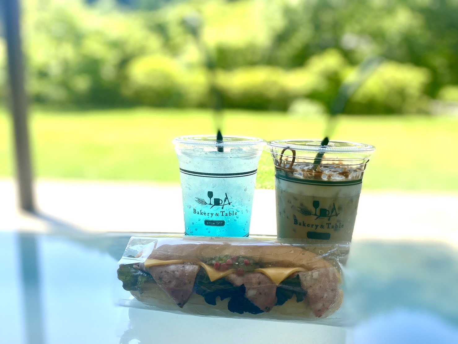 いっぱい遊んでたくさん歩いたのでお腹を満たしに近くの 「Bakery & Table 東府や足湯カフェ」 の気持ち良いテラスでeat in。