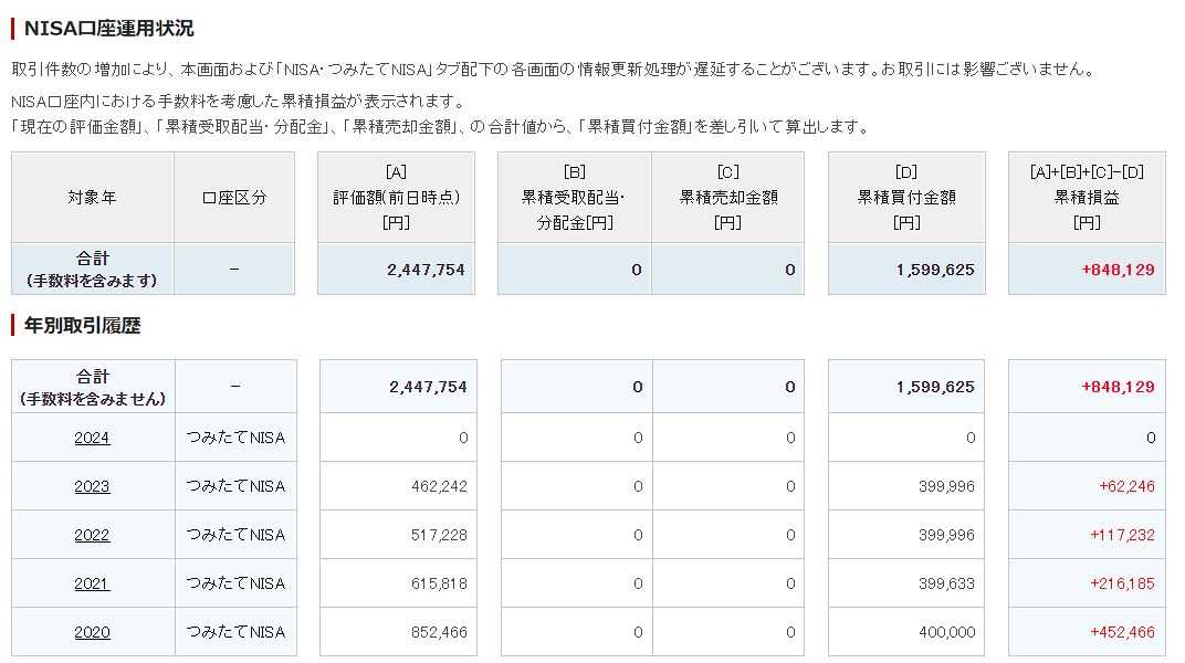 こんにちは新NISAが始まる前に現状の積立NISAの振り返りをしようかと思います。今年の8月に一度アップしていますが、現在4年間積立を行っており 出典:楽天証券現在+52%です。各年度ごとの取引履歴を見てみると、2020年度分は倍以上になっていました。驚きです。また、今年度に関しても+15%くらいは出ているんですね。これを見るとやっぱりインデックスに勝てる気がしないのでインデックスを毎月積み立てていこうという考えに落ち着きます。しばらくは上昇相場が落ち着き下落相場になるかもしれませんがその間に積立、15年後くらいに上昇してくれればインデックスのみで1億近くまで行けるのではと思っています。そうなれば私が勤めている会社では50歳から自主退社しても退職金が下がらないので、50歳で退職しようと思っています。28歳のときに、1000万ためたときは毎年倍にして4年後にFIREしようと思っていたのに4年経った現在ほぼ所持金が変わっていないので毎年入金分負けているということに・・・人生層簡単じゃないですね。来年も頑張ります。