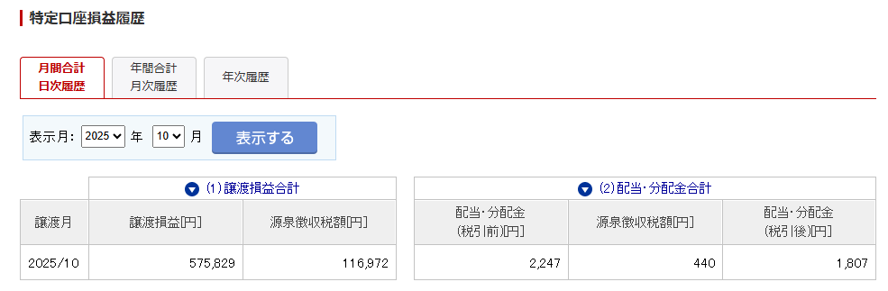 こんばんは10月の投資結果についてです。 出典:楽天証券今月は+575,829円でした。あと配当金が2,247円ありました。今月は現物トレードをしていたのでデイトレは少なめでスイングがほとんどでした。トレードした銘柄は三井海洋開発、JX金属、サンリオ、霞ヶ関キャピタルです。また、三菱商事を上場来高値を超えたときに多少売りました。今のポジションは三菱商事・三菱重工・安川電機・宇宙です。ちょうど現物と投資信託(ほぼ新NISA)が同じくらいの金額です。 出典:楽天証券8月から始まった楽天・JEPQの配当金(正確には分配金)ですが30万円分打診買い?をしていました。毎月2200円(税抜き1800円)もらってスマホ代にでもするかって感じです。売ってもいいですが高値圏過ぎるのと大した金額ではないのでとりあえず放置します。とりあえず今は現物で固めているのと余力は年末の新NISA購入用の資金しかないので売却はするつもりありません。また、利益が出ているときの握力不足を鍛えるために我慢を覚える訓練します。 以上