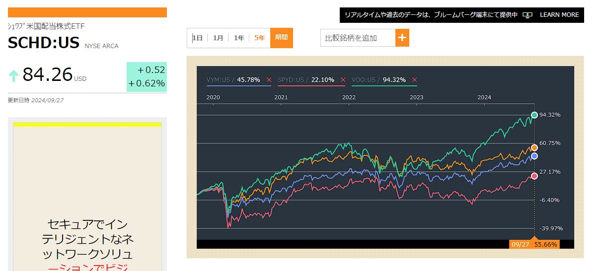 こんにちはずっとホールドしっぱなしと積立購入ばっかりで書くことがなかったのでブログを放置してました。今回はXで話題になってる楽天・高配当株式・米国ファンド(四半期決算型)を試し買いしてみました。楽天・高配当株式・米国ファンドとはシュワブ米国配当株式ETF(Schwab US Dividend Equity ETF)は米国籍のETF(上場投資 信託)。ダウジョーンズ配当100インデックスに連動する投資成果を目指す。(ブルームバーグ参照)ダウの中で増配率の多い企業を集めたETF(通称SCHD)です。分配金ありのETFで2月、5月、8月、11月の年4回に行われます。分配率は現状3.5%ですが、投資信託なので約20%の税金のみとなります。チャート自体は下記のようになります。上からVOO,SCHD,VYM,SPYDの5年チャートとなります。実際VOO買うのが一番利益出る気もしますが資産の何割かは配当金か分配金にしたほうがモチベーションが上がるので購入することにしました。また、SCHDの分配金の増配率はここ10年平均で約10%あるので今早いうちに買って放置しておけば今後結構な分配金になってくれると思い購入しました。 出典:ブルームバーグ 出典:楽天証券とりあえず50万円分購入。今後短期は円高、長期は円安だと思っているので1$135円位になったらまた購入しても良い水準だと思ってます。 以上