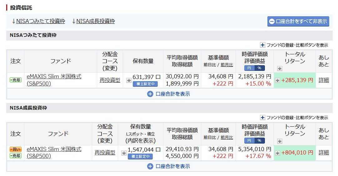 年初に半額を投資していたため、成長投資枠のほうが多少評価がいいですね(%の方です)