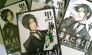 Gファンタジーで連載されている「黒執事」。10月6日からアニメ化が決定しました!5巻も先日発売になりました。放送時間はMBS 10月2日より毎週木曜25:25~CBC 10月2日より毎週木曜26:30~TBS 10月3日より毎週金曜25:55~東北放送 10月3日より毎週金曜26:15~静岡放送 10月3日より毎週金曜26:15~中国放送 10月4日より毎週土曜26:40~熊本放送 10月5日より毎週日曜25:50~北海道放送 10月6日より毎週月曜26:25~山陽放送 10月6日より毎週月曜26:25~RKB毎日放送 10月6日より毎週月曜26:30~(※放送日時は変更になる可能性有)となっています。★キャストセバスチャン:小野大輔シエル:坂本真綾バルド:東地宏樹フィニ:梶 裕貴メイリン:加藤英美里エリザベス:田村ゆかりマダム・レッド:朴 路美(路は王ヘンがつく字)グレル:福山 潤タナカ:藤村俊二 他19世紀後半、ヴィクトリア朝時代の英国。名門貴族・ファントムハイヴ家の執事・セバスチャン。彼は、知識・教養・品位・料理・武術…全てにおいて完璧。わがままな12歳の主人・シエルを相手に、今日も漆黒の燕尾服姿で華麗に執務をこなす。セバスチャンの口ぐせが“私は……あくまで、執事ですから―”ですが、この『あくまで=悪魔で』なんですねぇ。最初は好きな作家さんの書いた同人誌だったのですが、本編にハマってしまいました。そういえば、少年陰陽師も同じパターンでしたねぇ。(同人作家さんも同じ人です(*^.^*)エヘッ♪)同じような時間にフジ系で“西洋骨董洋菓子店”もやってるんですよね。どうしましょ??うーん、こっちをとるかなあ?