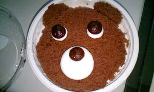 先日紹介した「ライオンくんプリン」を買った時に手に入れなかったもう1つのプリン。実は名前がうろおぼえだったので、ここで訂正しましょう。なぜ訂正できるか。・・・買ってしまったからなんですねぇ。(笑)「ヒグマさんチョコプリン」220円大きさは「白いクマさんプリン」も「ライオンくんプリン」も同じ。これでだいたいの大きさがわかるかな?横にあるのはマックのマウスです。ウインドウズ用の普通のマウスとだいたい同じ大きさだと思って下さい。中はねぇ、顔がチョコスポンジケーキ、目玉と鼻がチョコ、スポンジクリームの下にクリームがあって、その下にチョコプリンがあります。なんかたいして甘くなくて、このプリンの方が好きかも……。大人向けのチョコプリンって感じがします。今日はちょっとお昼ご飯を減らしてこれを食べちゃいました。なにせカロリーが273kcalで、ご飯1膳分よりちょっと高いんだよ。でも、美味しいですぅ~~~。