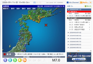 朝起きて、ラジオを聞いている時に、曲の途中で「緊急地震速報」が流れました。9月1日の防災の日に聞いて知っていましたが、震度5弱以上の地震の時に流すということで、“試しに”というのができず、どんなものかはわかりませんでした。でも、実際リアルタイムで聞くと、ちょっとびっくりしますね。今朝の地震は十勝沖。震源地のマグニチュードは7.0。震源地に一番近いところで震度5弱だったそうです。津波注意報もでましたが、幸いにもたいしたこともなく、津波被害はなさそうです。ラジオの番組もさきほどからずっと通常の番組ではなく、地震情報を流しています。速報を聞いた時は一瞬「何?本物か?」って固まっちゃいましたよ。私の部屋は横揺れで、ゆ~らゆ~らと揺れました。震度2みたい。今また余震もおきているようです。津波も予測よりも低い数値のようです。よかったよかった。今回の「地震速報」は初めてだったので、びっくりする人も多かったと思いますが、これに慣れると大分心に余裕が出来てくるかもしれないですね。まあ、そんなに慣れるほど流れては欲しくないですけどね。