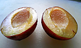 余ったギョーザの皮でおやつを作りましょ♪ってことで、試しでフルーツギョーザを作ってみました。今私の部屋にある果物というと、プルーンと梨。でも、食物繊維が豊富なので、プルーンでうまくできないかと試作品を。熟したプルーンを種にそって2つに切るとこのように種だけをとることができます。包みやすいようにみじん切りにしておきます。ギョーザの皮に小さじ1杯分を中央におきます。(あまり入れると皮が破けるよ)ホイルで焼くのでくっつかないように両面にマヨネーズ(カロリーハーフだとなおヨシ)を塗ります。そして3~4分オーブントースターで焼きます。出来上がり♪・・・ん~~~んo{{>.