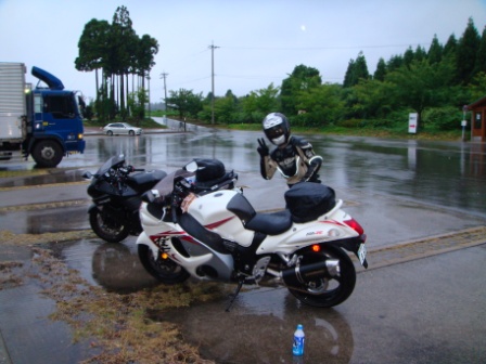 さて、前夜は宴会をして、心地いい疲れの中眠りについたのですが・・・。朝がた、ものすごい音で目が覚めます。カミナリです。かなりのハイテンションで鳴っています。強烈です。昨夜の天気予報で、天気が悪いことはなんとなく覚悟していましたが、それにしてもすごいカミナリ。しかし、出発時間にはカミナリもおさまり、路面はちょっとぬれているものの雨は降っていません。民宿のご主人にお礼を言うと、「ちょっとまってて」(といったと思うんだけど、方言というかなまりがすごくて何を言っているのかちょっとわからなかったです)といって、凍らせた500mlのペットボトルのスポーツ飲料を持ってきてくれました。あいにくの天気で、あまり必要なさそうですが、細かい心遣いがうれしくてありがたくいただきました。さて、朝7時過ぎごろだったか、バイクに荷物をつけて、ヘルメットを被って出発・・・・・の寸前で、突如として雨が降ってきました。いよいよ、初のカッパ着用か。。。。と悩んだのですが今までカッパを着ずにここまで来たのに、その記録が途絶えるのがなんとなくもったいないし、たぶんそんなに降らないだろうし(根拠は無し)カッパ出したり片付けたりするのもめんどくさいし。ってことで、まあ、大丈夫じゃない?と、そのまま出発。この判断がまずかった(>