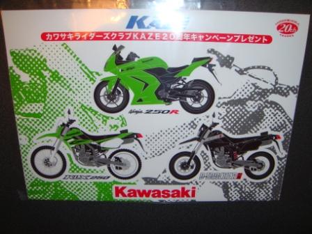 カワサキからなんか届いてるよ、といってしーがポストから封筒を持ってきた。でも、カワサキからなんか来るような覚えはないし、「もしやZZRにリコール?」なんて思って、緊張しつつ封筒を開けてみると・・・・・・・・・・いや、いらねーし。相変わらずセンスねーな、カワサキ。これ、なんだかKAZEの20周年キャンペーンのプレゼントだとか。それに当選したというんですが、応募した覚えはイマイチなくて(^^;)まあ、とにかく当たったんですが、このステッカー(ってかシール?)俺にどうしろというんだ? うちのサイトです。よろしければのぞいてみて下さいm(__)m