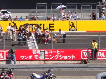 今回のMotoGP、レース以外にも楽しみなことがありました。2サイクル500ccのモンスターマシンのデモランです。しかも、マシンはワークスNSR、ライダーはアレックス・クリビーレです。昔からのファンにはたまりません。2サイクル、500ccの咆哮、鳥肌もんでしたよ( ^ー゚)bグッ! うちのサイトです。よろしければのぞいてみて下さいm(__)m