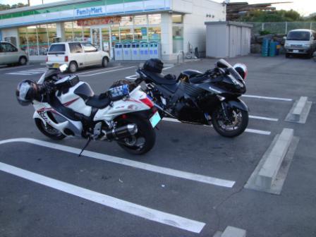 10月の12、13日で伊豆にツーリングに行ってきました。前から、「伊豆に行きたい!!」と思っていたので、念願の伊豆ツーです。当初予定では、土曜日曜でツーにいけば、月曜日の祭日はゆっくり休めるという計画でしたが天気予報では、土曜日は雨。予定を一日延ばして、土曜は仕事をしました。しかし、予報に反して土曜日もいい天気。仕事をしながら、「今日いけたじゃん!!」とストレスを感じながらも「天気予報では日、月のほうが天気がいいようだし」と自分に言い聞かせてこの日は乗り切りました。このときの天気予報では、日曜日も月曜日も「晴れ」の一言。完璧です。そんなわけで日曜日の朝は6時にいつものコンビニに集合。この時期になると、高原の朝はさすがに寒いです。手が冷たいです。でも、がんばって高速に乗っちゃいます。伊豆に行くまでの道中に時間をとられて、伊豆が楽しめないのは嫌なので「とにかくなるべく早く伊豆まで行く」という計画です。ルートは東伊豆から侵入。時計回りにぐるっと伊豆半島を回り、西伊豆から抜ける予定。ただし、この日はF1が富士で開催されているので、渋滞に巻き込まれないかが心配。しかし、結果的には渋滞には一切つかまらず、朝9時には芦ノ湖まで来ちゃいました。芦ノ湖スカイラインから、芦ノ湖を見たところです。この写真を撮るのに、バイクを止めたところがこんなところだったんですが、なんだか走り屋がたくさん走っていました。見た感じ、バイクとツナギと音はすごかったです。こんな人たちにあおられたら嫌だなぁ、なんて思いつつも出発。だって、あおられたりしたら、道譲らないといけませんから。で、譲ったあとに後ろからあおりたおしたくなりますから。結果的に案の定あおられました。ZZRとハヤブサの2台ですから、目をつけられるんでしょうね。で、あおられたのでちょっとアクセル開けてみたら、いなくなっちゃいました( ̄ー ̄)アドバンス4番もchupa君も、峠やレースをほんの少しかじっていますからね、タイヤを端まで使うことくらい出来ますよ~。(でも、怖くてカウルするほどは倒せませんよ~。ダサッ)そんなこんなで芦ノ湖スカイラインから、そのまま伊豆スカイラインまで走ります。ここでも、なんだか元気なのがたくさん走っています。それもそのはず、この先のドライブインに入ったら・・・この台数!!こんなにバイクが集まったのを見るのは、川崎ミーティング以来です。しかも、この中の半分近くはツナギ着ています(^^;)なんだか、自分が峠を走っていた頃のことを、懐かしく思い出しました。なんだか血が騒ぎますが、こういうとこにはバイクはSSでツナギを着てこないとどうにもなりませんから、おとなしく退散~。無理して転ばないようにね~。さて、ここから伊豆スカイラインを降りて伊東方面に下りて、お昼ご飯です。うにの石焼丼です。マグロも入っています。テンション上がりました。さすが、海の近くです。すごいです!!・・・でも、石焼なので食べるときはマグロもウニも火が通っちゃって(^^;)新鮮な海産物を楽しみたいのに、完全なミスチョイスでした(T T)ものめずらしさより、生のまま、醤油たらして食うのが一番だと悟った瞬間でした。気を取り直して、伊豆の海岸線をひた走ります。こんなとこやこんなとこを通り抜けて、いよいよ伊豆半島最南端、石廊崎です。上の写真とたいして変わらないと思いますが、こっちが石廊崎です(^^;)写真では分かりませんが、とっても高い断崖絶壁。迫力があります。海がきれいです。かっちょえ~~~!!って感じです。そして、断崖にへばりつくようにして神社が建っていてびっくり。一応、安産お守りを買ってみたりして(^^;)今回も宿は予約していませんでしたが、難なくゲットできました。今回は前回より1000円高い4000円(素泊まり)でしたが、温泉民宿という事ですし建物もきれいで、満足でした。ここのオヤジがバイク好きで、BMWを所有していました。バイクの話でも盛り上がったし、宿代ちょっとまけてくれたし、とってもよかったです。しかも、ハヤブサとZZRをみて、「写真撮らなきゃな!!でも、今撮るよりも明日の朝、朝日が出てきてからのほうがいいな」なんて、喜んでましたよ。ホントにバイク好きなんだろうなぁ(^^)夕食は、近くのお店で食べました。お昼ごはんの反省を生かして、刺身定食です。新鮮です。同じ魚でも味が違います。おいしいです!!山育ちって、海が見えたり、新鮮な刺身が食べられるとテンションが上がるんですよ。で、宿に帰ってきて風呂に入り、恒例の宴会です。宴会をしながら、明日のルートを決めます。「ここ、駿河湾越しの富士山が見えるってさ!!すごくね?」「桜海老のなんかが食べれるみたいだよ」「おい!!ここ、フェリー乗れるじゃん!!こんな機会ねーぞ!!のってみるか?」「帰りは富士宮でB級グルメ、焼きそば食おうぜ!!」と、大盛り上がり。幸せの絶頂でした( ^ー゚)bグッ!しかし、悲劇が訪れます。なにげにテレビに目