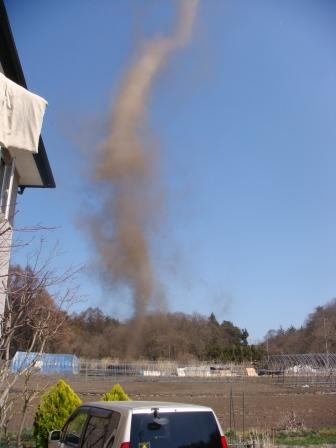 今日はうちの子の初めての予防接種があったり、野良猫がうちに侵入してきてうちの猫と激しいバトルをしていたり、60個の仕事を目の前にして呆然としているアドバンス4番がいたりと、いろいろ事件(?)が多い日だったんだけど、極めつけはこいつでした。昼過ぎ、ぽかぽか陽気の中、窓を全開にして仕事をしていると何やら風が吹いてきて・・・。おや?と思っているうちにだんだん強くなってきて、窓なんかが「ガタガタ」音を立て始めどんどん風が強くなっていきます。ついには図面なんかが舞い始めたのであわてて窓を閉めようと思ったアドバンス4番の視線は釘づけに。なんとまあ、窓の外にはどでかい竜巻が(llllll゚Д゚)ヒィィィィしばし呆然としていたものの、ふと我に返り「これはネタになる」と思いカメラでパシャリ!!しかし、その時には既に消える寸前。そんなわけで写真の竜巻はなんだかしょっぺぇ感じになっちまいましたがこいつのおかげで、ベランダに干してあったアドバンス4番の布団が吹っ飛び(いや、しゃれじゃなく)、洗濯物が踊り狂い庭のアドレスが倒れちゃいました。仕事場の中もなんだか砂埃がすごくて、今もパソコンのキーを打ってるとなんとなくじゃみじゃみした感じです(T_T)こうして、ほんの一瞬の出来事にも関わらず、アドバンス4番家に多大の被害を出した竜巻は消えていきました。不幸中の幸いは、アドレスのすぐ横にZZRが止めてあったんですが、将棋倒しになることもなく、倒れたアドレスがぶち当たることもなく無事だったことです。春の珍事でした(^_^;) うちのサイトです。よろしければのぞいてみて下さいm(__)m