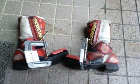 つなぎについては何の問題もなさそうでしたが一つ盲点がありました。ブーツです。6~7年ぶりに箱から恐る恐る出してみたら・・・・・ソールがはがれかかってる。そういえば、いかさんもレース中にソールがはがれたって記事があったような。こういうことだったのか!!久しぶりにブーツはこうとするとソールがはがれちゃうぞって事だったのか?って事で、いまアドバンス4番のブーツはこんなんなってます↓現役時代以来のG17(接着剤)登場で、ソールを張り付けてみてます(ーー;)しかし、こうやってソールがはがれかかっているブーツを見るとほんとに久しぶりのレースって感じですね。昔とった杵柄って事ですか?歳とったなあって事ですか?あ~やだやだ。 うちのサイトです。よろしければのぞいてみて下さいm(__)m