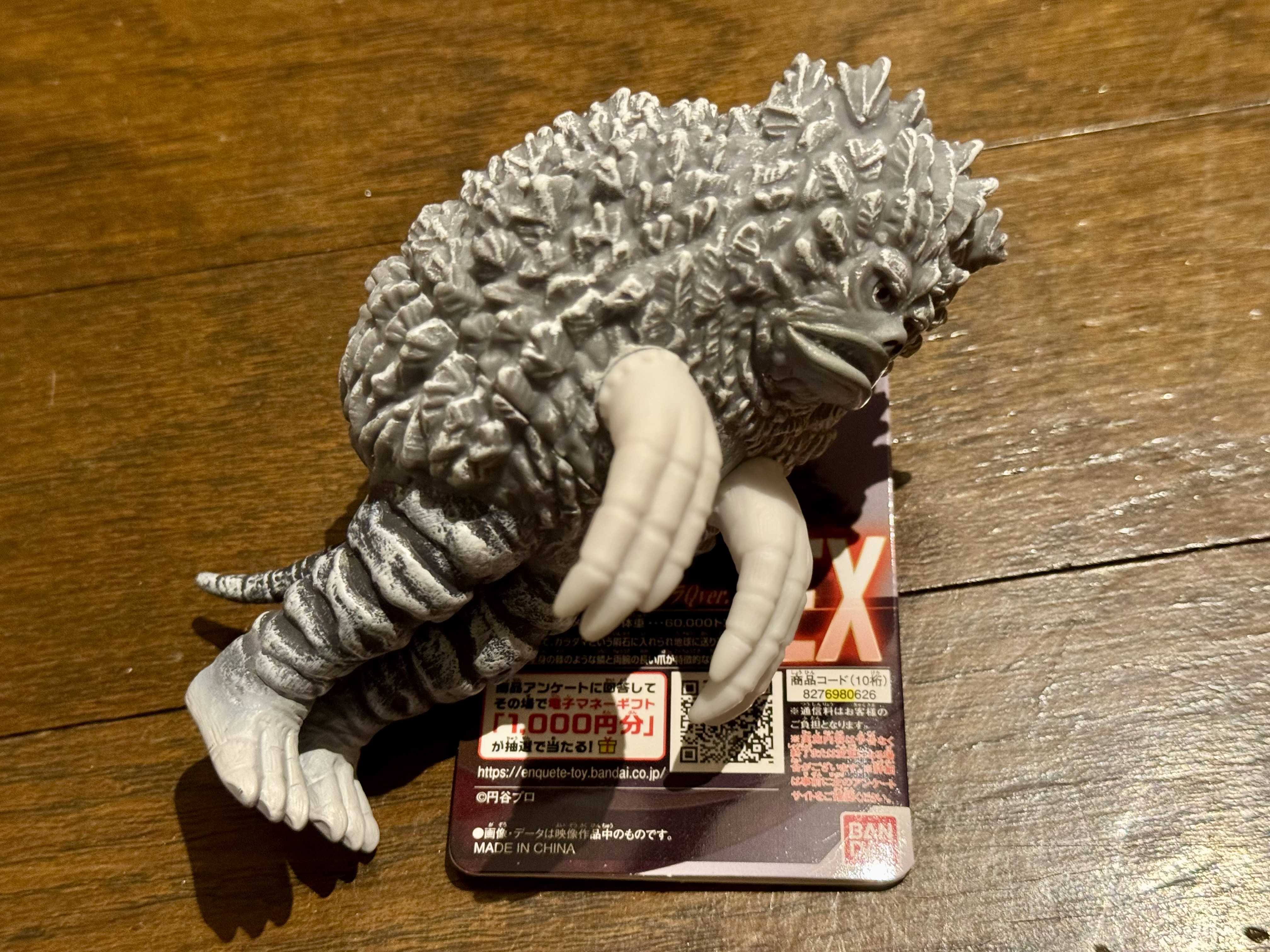 ウルトラシリーズのソフビには時々限定品がある。ウルトラマンフェスティバル(通称ウルフェス)限定だったり、ゲームセンター限定だったり、ショップ限定だったりする。1月に紹介したウルトラマン80の必殺技の一つ「ダイナマイトボール」は、ウルトラマンショップとイベント会場とワールドM78オンラインでしか発売しない販売経路限定だった。9月某日に買ってきたのは、ヤマダ電機限定発売のウルトラ怪獣シリーズ EX ガラモン ウルトラQ ver. だ。7月発売のため、すでにヤマダ電機の店頭から消えたと思っていたら、地元店舗の別怪獣の裏にひっそりと忍んでいた。ガラモンはウルトラQに出てくる隕石怪獣。いや、セミ人間に操られるロボットである。自分は別にガラモン好きではないものの、1966年のウルトラQは今でも見るので、購入した。新しく金型を起こしたわけでもない、既存ソフビと塗装が違うだけの、10cm足らずの人形が899円とはなかなかのものだ。が、ウルトラQがモノクロ放送だったことを受けた色彩は、妙に惹かれるものがある。実はウルトラ怪獣シリーズ EX ウルトラQ ver.にはカネゴンもあって、こちらはPPIHグループ(ドン・キホーテとか)限定販売だった。年始に発売になった。ネット情報に乗り遅れ、近所に店舗もなく、探したもののこちらは買い逃してしまった。カネゴンの方がデザインに愛嬌あるし、こちらが欲しかった。というか、ガラモン ウルトラQ ver.を持つ今となっては、セットにしたい。限定品は半年以上寝かせると値が上がるのが常だ。カネゴンは、メルカリやヤフオクを通じて高値購入することはできるが、それも転売の思う壺でちょっと悔しい。