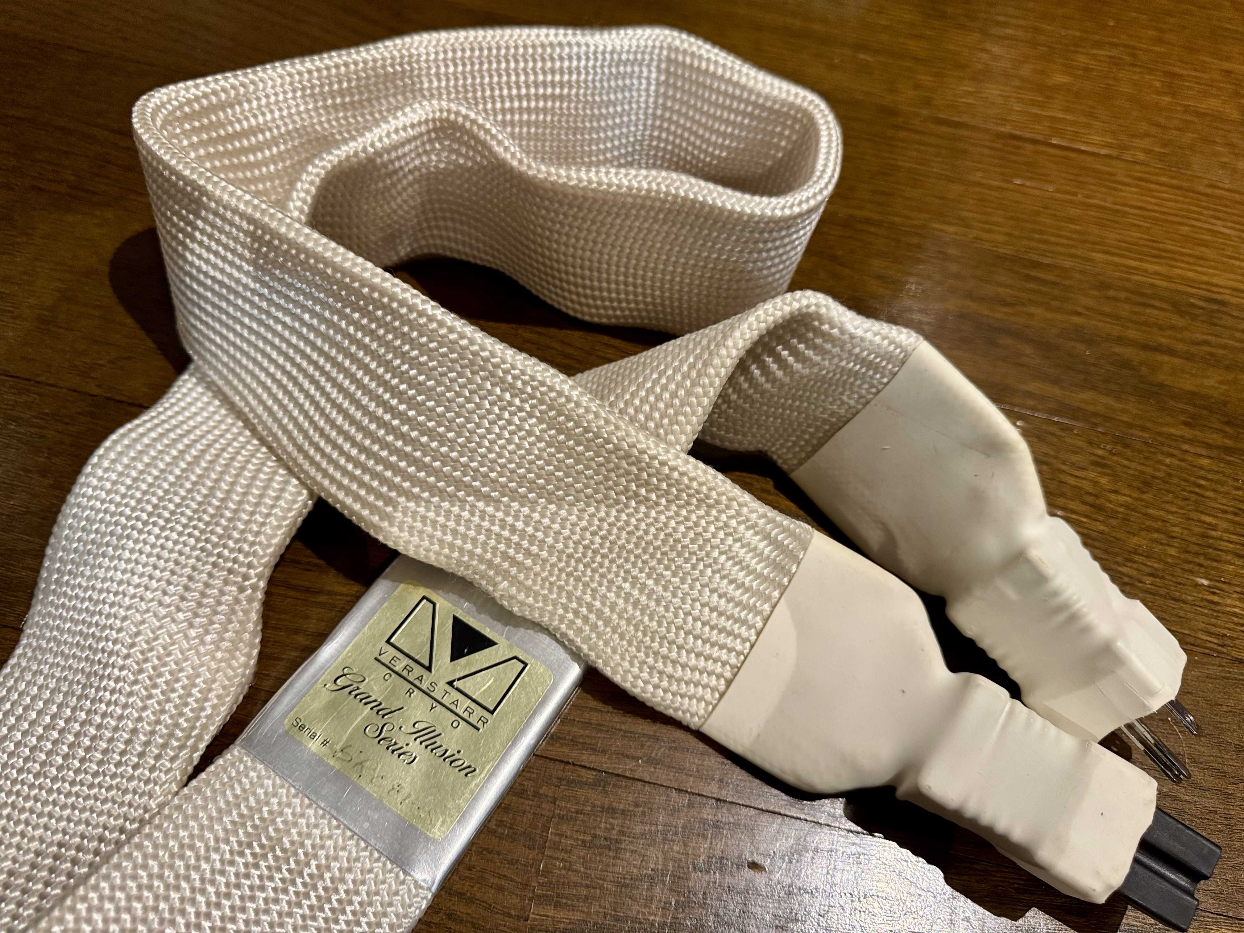 我が家にある最も高額なACケーブルは何か。国内定価も変わっていくし、最新のケーブルを持ち合わせてもいない。高額なケーブルが良い音を醸し出す、といった思い込みからは既に逃れているので、買うこともなくなったし、だいぶ売り払ってもきた。そんな中、使いもせずにずっと死蔵していたケーブルがある。米国のオーディオ用ハイエンド・ケーブル・メーカーである Verastarr(ヴェラスター)の製品だ。2001年発足と20年以上の歴史がありそうなのに、日本で代理店が付いたことはなかったはずだ(今もメーカーはあるのだろうか。HPは2020年更新まで)。手元にある(正式名称も今や不詳の)Grand Illusion AC power cord の販売価格ははっきりしないが、1,799ドルはしたかもしれない。なぜ代理店が付かないのか。会社的な理由は知らないが、製品に関しては写真を見ても理由は一目瞭然。そしてその異形に驚くだろう。丸線ではなくフラットな金属箔(フォイル)導体を採用する「AudioFoil®」がコンセプトであり、銅/銀のソリッド・フォイルで低歪み・広帯域を狙う設計思想が打ち出されてる。日本のPSEからしたら「ウソでしょ?」で、PSE認証が取れるはずがない。そして音も非常に変わっていると思う。他の何者とも違う、これにしかない際立った特長があった。海外レビューでは、Grand Illusion AC power cordは、静寂感/ダイナミクス/音場の広さ/解像度の高さ/情報量などを評価する声が高い、らしい。だが自分にとってGrand Illusionは、解像度には程遠く、キラキラしていて膨張傾向、しかもシロップのように甘いケーブルだった(あくまで感覚)。2020年代のハイエンドオーディオで、膨張音が歓迎されるわけがない。結果的に、持っていて満足するだけのACケーブルに成り下がっていた。ただ「他と全く異なる」一点で手放せなかった。話が少々違ってきたのは、DENON AVR-X3800Hが、夏場の室内のペットボトルのミネラルウォーターみたいな音だったことだ。無味ではあるが爽快ではなく、健康にはよさそうだが美味くはない。どうせ飲むなら冷えている方がよい。だからプリアウトで接続するGOLDMUND Mimesis SRがマッチしたのだ。いっそ Pass Labs Aleph3のように能動的なら、それもそれだったのに。経験上 温度感が高いアンプをケーブルで下げることは難しい。これも感覚的だが、味を変える方が早いかな。そこでものすごい久々の Grand Illusion AC power cord だ。AVR-X3800Hに接続して、急に音がハイエンドに寄り出すことはないにしても。フロント2chをMimesis SRに委ねれば、薄目のカルピスのようで悪くない。少なくとも、上記AI回答の静寂感と音場の広さは感じられる。珍しくハマった。ちなみにDenon AVR-X3800Hのアメリカでの販売価格は、通常 1,699ドルらしい。それより高そうな Verastarr Grand Illusion AC power cord の接続には抵抗がないわけでもない。が、そこを言い出すと接続機器が限られ、また死蔵になるので気にしないことにする。