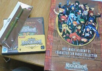 DS版QMA届いたー!左から専用タッチペン、ゲームソフト、その上に乗ってるのが限定アミューズメントPAS、そして缶バッチケース。オリジナルポーチは先日書いたけど生産遅れだって。PASは4稼動時のリエル先生絵柄みたいにキャラ絵の方が良かったなぁ。これはこれでカッコイイけど。で、気になるのは謎の缶バッチ。なぜ缶バッチ?ケースはやたら豪華なのでちょっと期待して開けてみた。上段左から2番目がますみん、三段目左端が広橋、3番目が新キャラの中原麻衣。いや、素敵バッチだとは思うけど缶バッチ…しかも微妙な縦長サイズ。どこで使えば……。まぁ、いいや。とりあえず遊んでみよう。