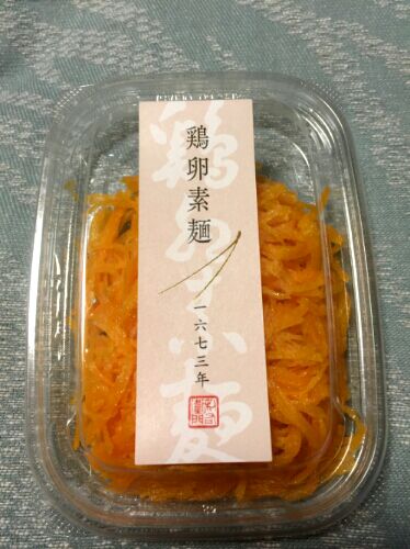 本日もお菓子の話です。 福岡で買って来た、松屋利右衛門の「鶏卵素麺」をいただきました。 材料は鶏卵と砂糖だけで、甘いカステラのような味でした。 思っていたよりもちょっと甘かったですが美味しかったです
