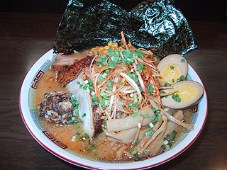 本日は普通に仕事。ちょっと早目に帰宅、玉子ちゃんとラーメンによって帰りました。だいたいいつも俺の好みで、とんこつ醤油(魚だし系)に行っておりますが、今日は帰り道にある、旭川ラーメン「まるしゅう」にて味噌ラーメンを食べた。うまい!しょっぱさがうまい!!玉子ちゃんもお喜び。ほんで帰宅。そんな感じ。家に帰ってからは、玉子ちゃん持参の ごっつえぇ感じのビデオを見た。おもろいな~~DVDはもっといろいろハイっているので是非買って見たい。そしてまったりしたいもんですな~~。笑ってるとガンになりにくいらしいよ! 全部のせ味噌ラーメンです。