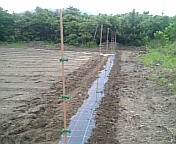 島内の農家さんが自然薯の植え付けをはじめたので見に行ってきました。この農家さんは山から掘り出してきた自然薯を種芋にして自然薯栽培をはじめて今年で3年目となります。新島でも隠れ自然薯栽培家がかなりいるらしいのですが、なかなかうまくいっていないのが現実のようです。しかしこの農家さんはある程度その技術を確立してきており、昨年も1kgを超える1年ものの自然薯を何本も掘り出しました。 ただ昨年はネコブセンチュウの問題が発生しまして、今年は4月に土壌消毒をして準備を整えてきました。また4月上旬にふせこんだ種芋もここ10日ぐらいの間でツルがよく伸びてきましたので植え付けをはじめることとしたのでした。 植え付け方法を簡単に記しますと。(1)クワ幅の50cmぐらいの溝を掘ります。(2)溝の端に傾斜角30度ぐらいに土で傾斜をつけます。(3)そこにクレバーパイプ(自然薯栽培用のパイプ)がおさまるような型をつけます。(4)クレバーパイプに無肥料で土壌病害に汚染されていない土を入れます。(5)土を充填させたパイプを傾斜におさまるように置き、土をかけます。(6)クレバーパイプの上の方の広くなっているところに目印用の竹をさし、土を20cmぐらい盛ります。(7)そこに芽や根が伸びた自然薯の種芋をのせ、さらに5cmぐらい覆土します。とりあえずそんな感じでしょうか。 神津島でも自然薯栽培をしている農家がいまして、秋には贈答用やお歳暮などに利用され喜ばれているそうです。新島でも広まったらと思っています。
