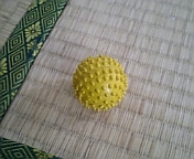 写真にある黄色いトゲトゲの物体、これって何だと思います? 先日子供がどこからか拾ってきて我家に転がっている代物。直径5cmぐらいで周りにトゲトゲがついています。材質は固めのゴムみたいなものからできているようです。 わたしも子供の遊び道具だろうと思って別に気にもしていませんでした。 ところが昨日の朝、コーヒーを飲みながら部屋の中をウロウロしていたらちょうど鏡の前にこの黄色い物体が転がっていました。何気なく鏡の前に立ち、そして何気なくその黄色い物体に足を乗せましたら、・・・・ビビビビ・・・・、キマシタキマシタ・・・・、フォー・・・・すげー気持ちいいじゃありませんか。 足の裏でこの黄色い物体をころころ転がすと、ちょうど足のつぼみたいなところを刺激して五臓六腑まるでマッサージされている感じ、思わずコーヒーを飲むのも忘れてその感動とその至福の時間に浸ってしまいました。 ちょっとしたキッカケから思わぬ発見!! これから朝の日課になりそうです。 だけどこれって当たり前に知られている商品なんでしょうか?とりあえず「とげコロリン」と名づけました。