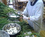 ゴールデンウィークの5月3日・4日の午前中、新島では商工会が主催の観光朝市がありました。 村内の公園で開催された今回の朝市には、漁協や農協などいくつものテントが並び、島の物産が販売されました。 農協コーナーでは手造りの加工品や、野菜、トウキョウXの豚肉などが陳列されましたが、一番の目玉は「ショウブ」だったでしょう。これは上新粉を練ったものをカヤで包んでゆであげたもので、昔から端午の節句にあわせて島の何処の家でもこしらえたようです。しかしカヤを刈ってきたり、練った上新粉を包んだりするなど手が込むので、今ではあまりつくられなくなってしまいました。ただこの朝市には島の女性たちがこの「ショウブ」をつくり出品してくれます。 5月1日ごろから農園の加工室で5~6名の女性たちが集まってコツコツつくり、多分1000個ぐらいは作り上げたのではないかと思います。夜も9時過ぎまで残って頑張ってやっていました。 しかしこの「ショウブ」は大変な人気のため、瞬く間に売り切れてしまい、わたしも買おうと思ったときには、既にない状態でした。 おばさんたちお疲れ様でした。 <ショウブつくりの様子>