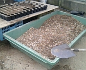 先日今年3回目のキュウリ苗の接木作業がおこなわれました。 キュウリの育病は3月・4月・5月・6月の4回に分けておこなわれていまして、時期による販売数をかんがみながら、合計で5000~6000本のキュウリ苗を生産しています。 ところで以前のブログにも書いたかもしれませんが、どうもキュウリの本葉1枚目に生育障害が発生してしまうのです。ちょうど接木苗の切断作業後であるので、養分の移行がうまくいかないために発生しているということも考えられるのですが、なんとも納得行きません。 病気でも害虫の影響でもなく、いわゆる生理障害の部類です。ですからその後のキュウリの生産には影響はありません。 いろいろ液肥をかけてみたりしてだいたいの原因はつかめており、改善もされてきているのですが、生産者としてはやはり少しでも完璧に近づける苗を作り、皆さんに喜んでいただきたいわけです。「苗半作」という言葉もありますしね。 というわけで培養土づくりからもう一度考え直してみることとしました。資材の配合比率や与える肥料の内容や量も再度計算し、土づくりしてみました。今回の接木苗の生育過程をよく観察してみたいと思います。多分試行錯誤となるでしょうが・・・。