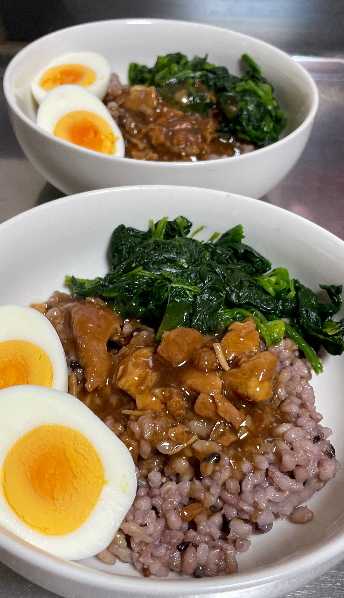 お皿に雑穀米を盛り付けて、ルーローハンの中身をかけて